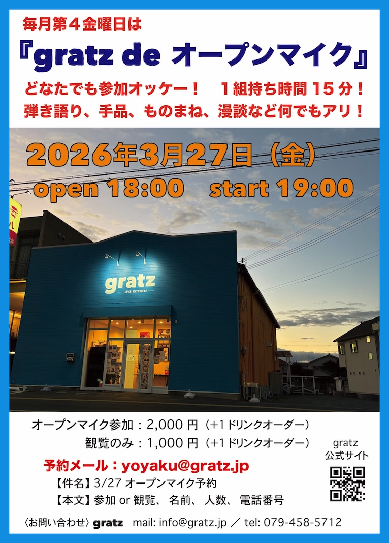 【お問合せ】LIVE KITCHEN gratz 079-458-5712 info@gratz.jp