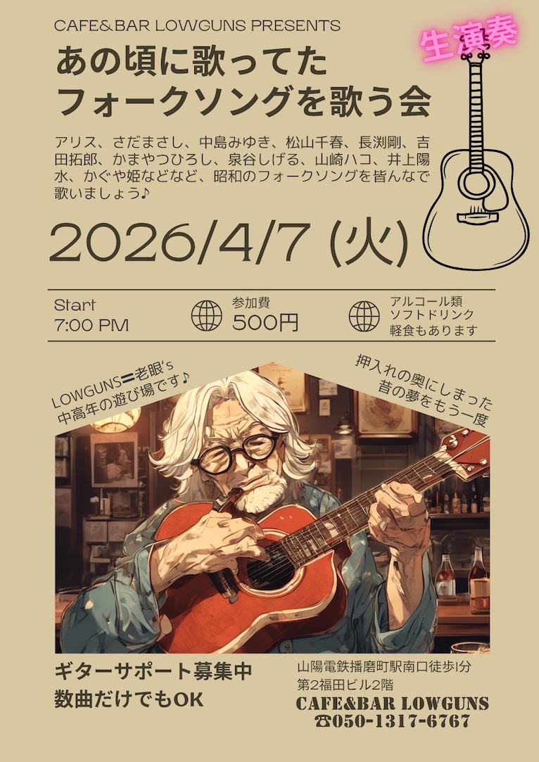 【内容】お好きなフォークソングをリクエストして、ギターやピアノの伴奏で歌えます♪ (*演奏できない曲もありますが、、、