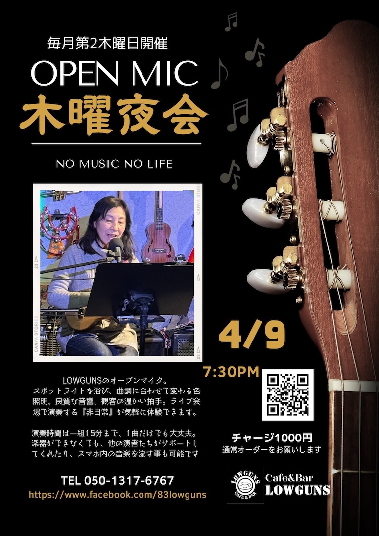 【内容】LOWGUNSのオープンマイク『木曜夜会』 持ち時間は一組15分程度。初心者大歓迎です♪ステージで演奏するという“非日常”を体験しましょう♪