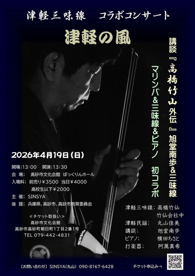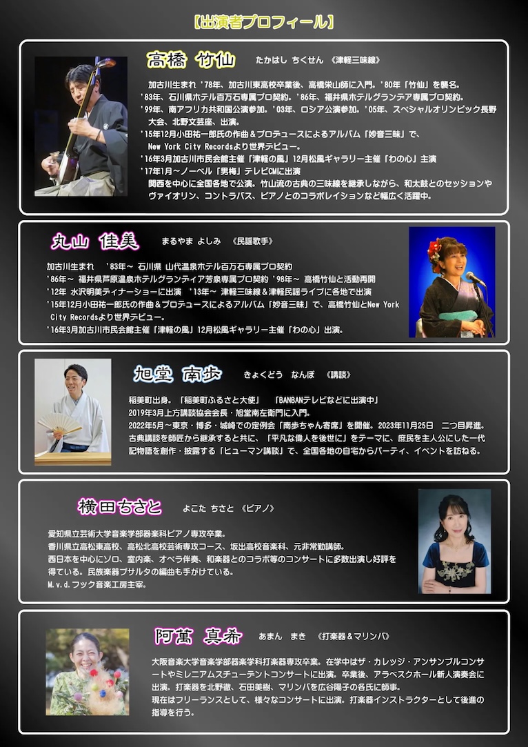【内容】講談『高橋竹山外伝』 旭堂南歩&三味線  マリンバ&三味線&ピアノ 初コラボ