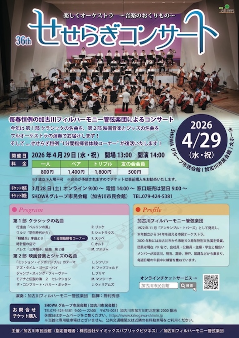 【内容】毎春恒例の加古川フィルハーモニー管弦楽団によるコンサート。第1部はクラシックの名曲を、第2部は映画音楽とジャズの名曲をフルオーケストラの演奏でお届けします。今年は、せせらぎ恒例「 1分間指揮者体験コーナー 」が復活いたします!
