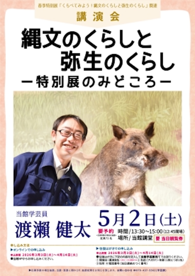 【内容】現在兵庫県では、縄文時代の遺跡が約700か所、弥生時代の遺跡が約2,200か所見つかっています。これらの遺跡を発掘することによって、それぞれの時代に生きた人々がどのような暮らしを送っていたのか、次第に明らかとなってきました。そこからは、「狩りから稲作へ」といった従来の歴史観を塗り替えるような成果も上がってきています。本展では、県内の出土品を中心に教科書を深堀りし、縄文時代と弥生時代のくらしを紹介・比較し、二つの文化の共通点や違いを探ります。