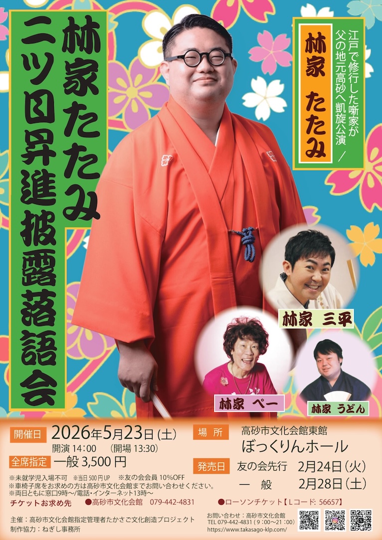 【内容】林家たたみさんの二ツ目昇進を祝う、晴れの日の落語会。この節目の高座を、ぜひ会場でお楽しみください。
